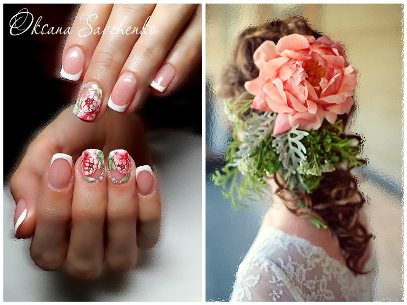 Как вариант, можно исполнить французский маникюр, как классический, так и разных вариантов и украсить его аккуратными нежными цветами красного цвета. Можно красный вызывающий лак заменить на более нежный – розовый.