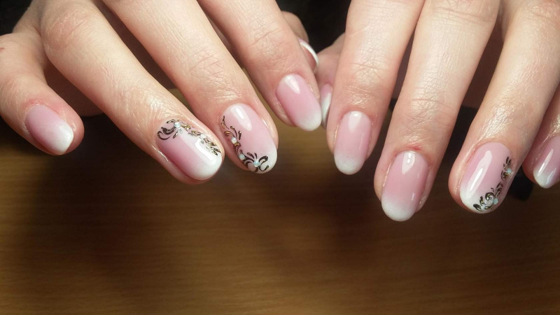 - градиент используется для декора «линии улыбки», остальная часть ногтя покрыта базовым лаком