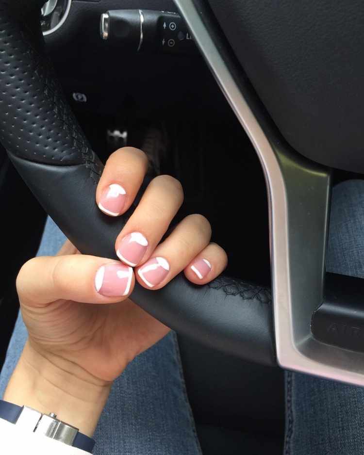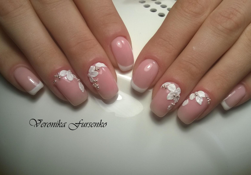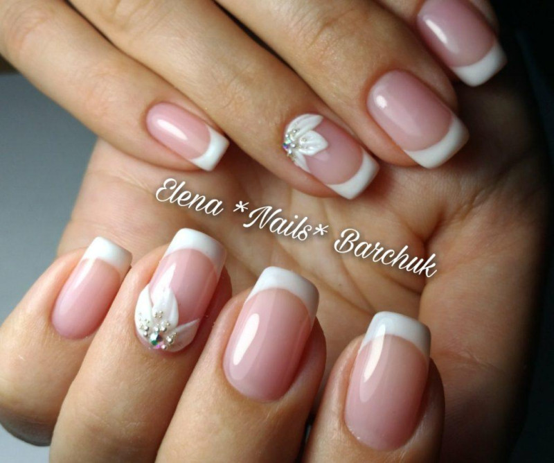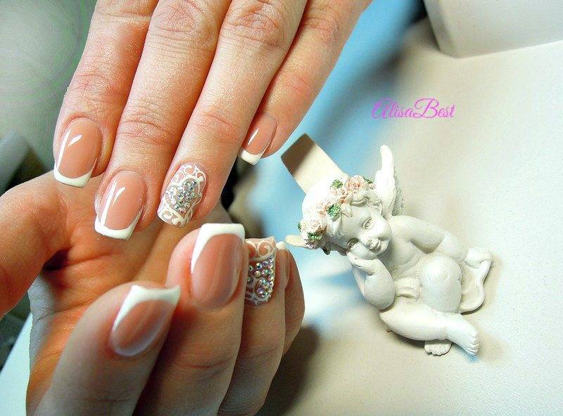 - Французский маникюр довольно просто выглядит на руках, но на самом деле он просто восхитителен! Сейчас у многих женщин такой тип маникюра блистает на ногтях. Но по сути-это просто белая полоска на краю ногтя, а большая часть окрашена в телесный или персиковый цвет. Выглядит очень естественно. При желании такой маникюр можно украсить маленькой блесткой или камушком, которые продаются почти во всех магазинах с лаком. А вот рисунки при таком маникюре наносить не рекомендуем.