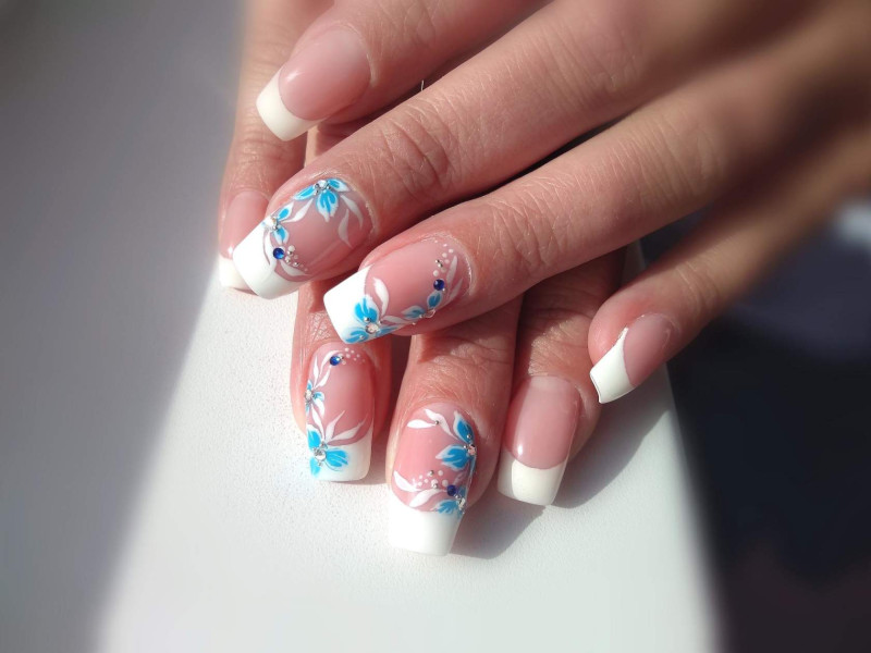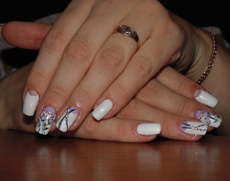 После высыхания белого лака наносят финишное прозрачное покрытие. Выполняют любой декор, который задуман для создания готового нейл-образа.