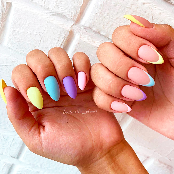 В пастельном используются сиреневые, розовые, мятные тона, голографические или жемчужные покрытия. Сверху обязательно наносится светящиеся покрытие, жемчужная втирка, выглядит нежно, в том числе и как свадебный вариант.