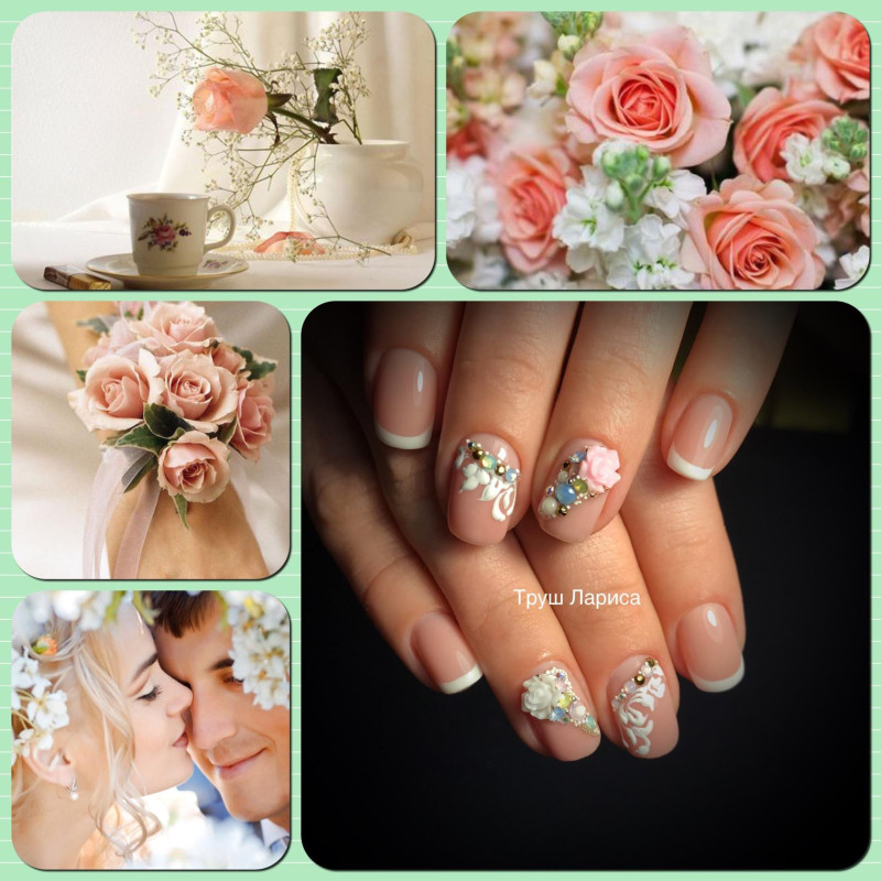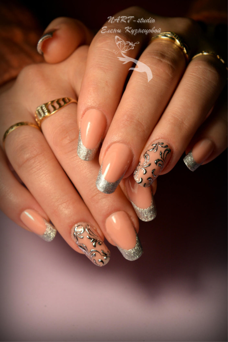 Часто используется как праздничный. Нюдовый прекрасен с серебром. Сегодня в моде эффект омбре, украшения. Серебристым можно подчёркивать декор лентами, использовать паутинки, надписи.