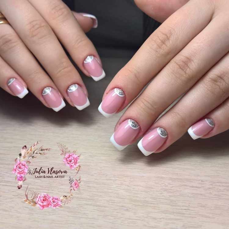 Строгий дуэт французского дизайна и гламурных блёсток создаёт на ноготках невероятный дуэт, который может сыграть роль завершающей нотки любого праздничного или торжественного образа