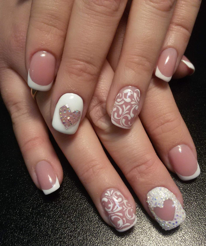 Нежный, женственный вариант оформления ногтей. Для френча используют шеллак или гель-лак розовых оттенков. Край ногтевой пластины может иметь разную форму: абстракция, геометрия, сердце. В качестве декора используют стразы, блёстки.