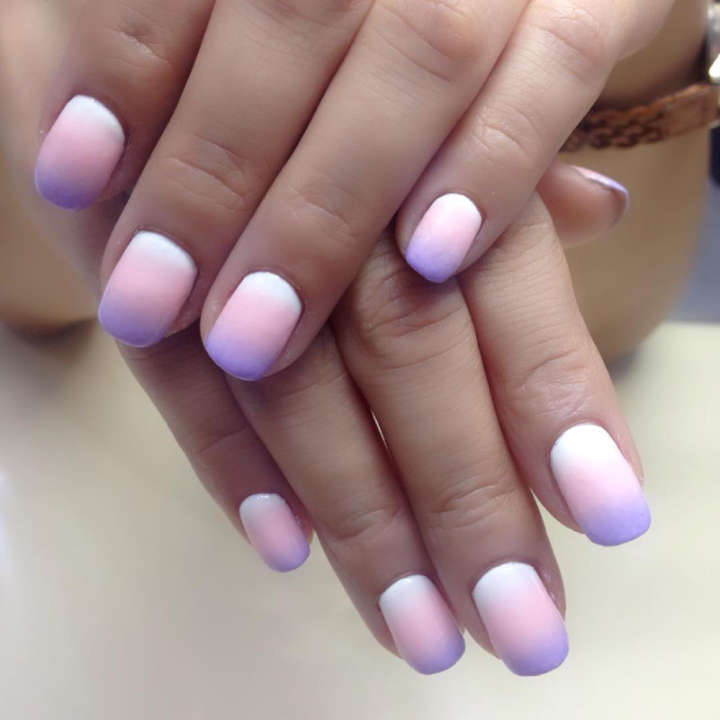 - Лак пастельных цветов очень нежно и женственно смотрится на руках. Обычно пастельные цвета не слишком яркие и хорошо будут смотреться под платья, юбки и блузки. Такой маникюр будет прекрасно смотреться даже без лишних вмешательств, но при желании можно добавить тоненький узор или простой рисунок. Самые популярные пастельные цвета: голубой, розовый и белый, но также пользуются большой популярностью фиолетовый и синий. С помощью таких мягких оттенков очень удобно и практично сделать себе модный градиентный маникюр. Градиент-совмещение нескольких цветов, плавное перетекание одного оттенка в другой. Такой маникюр можно сделать и дома при помощи губки, но для этого нужно немного попрактиковаться.
