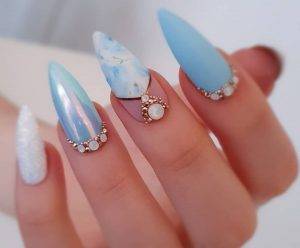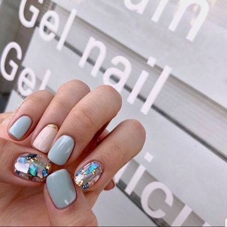Небесные оттенки ассоциируются со свободой, беспечностью и гармонией. И, конечно, это море, волны, соленый бриз. Голубой маникюр — отличная идея для праздника в морской стилистике.