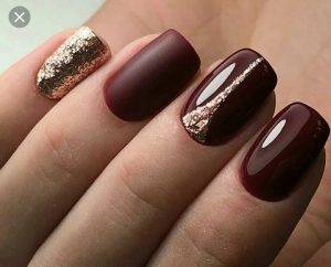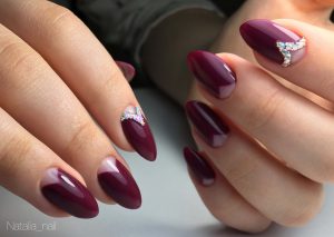 Благородный оттенок марсала также подойдет для яркого свадебного маникюра, особенно если использовать комбинированные техники с трафаретными белыми розами, бардовым шиммером, камнями и прочими декоративными элементами.