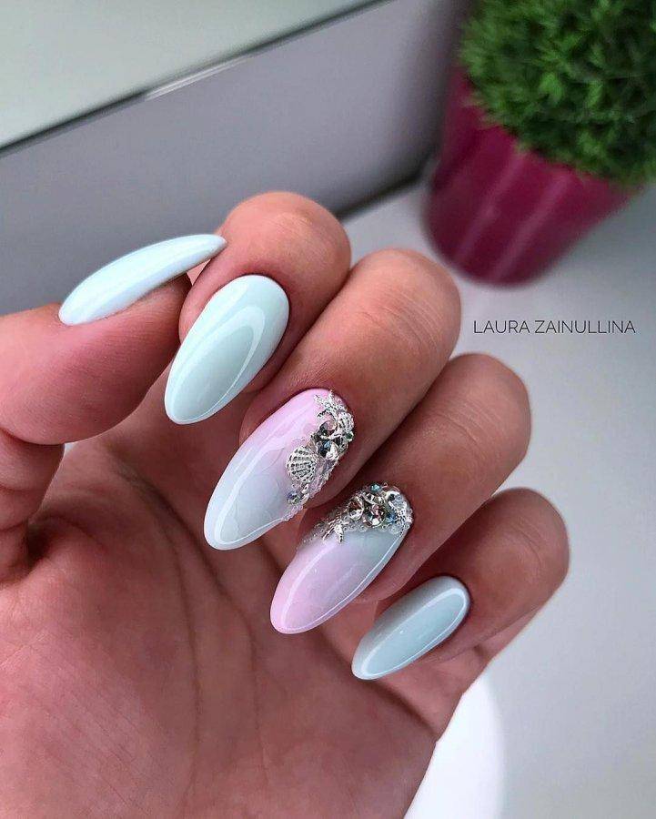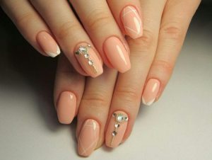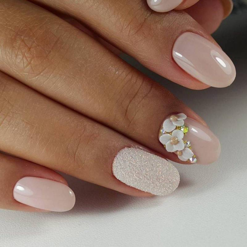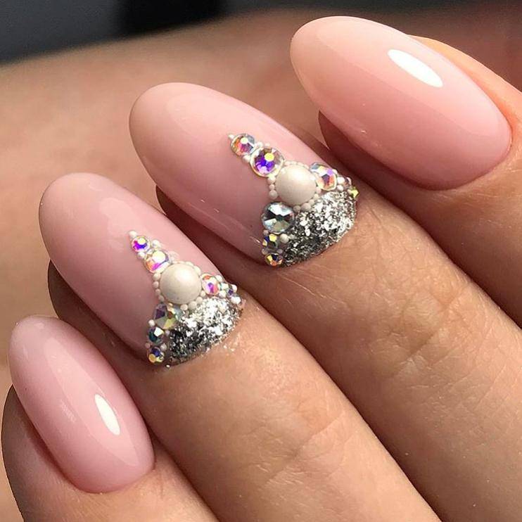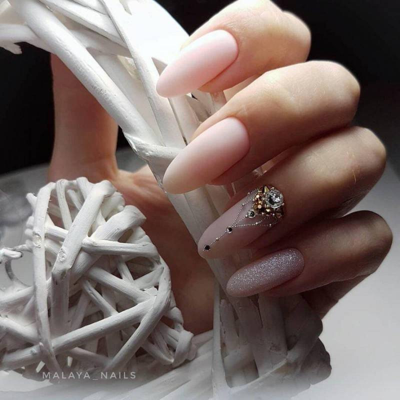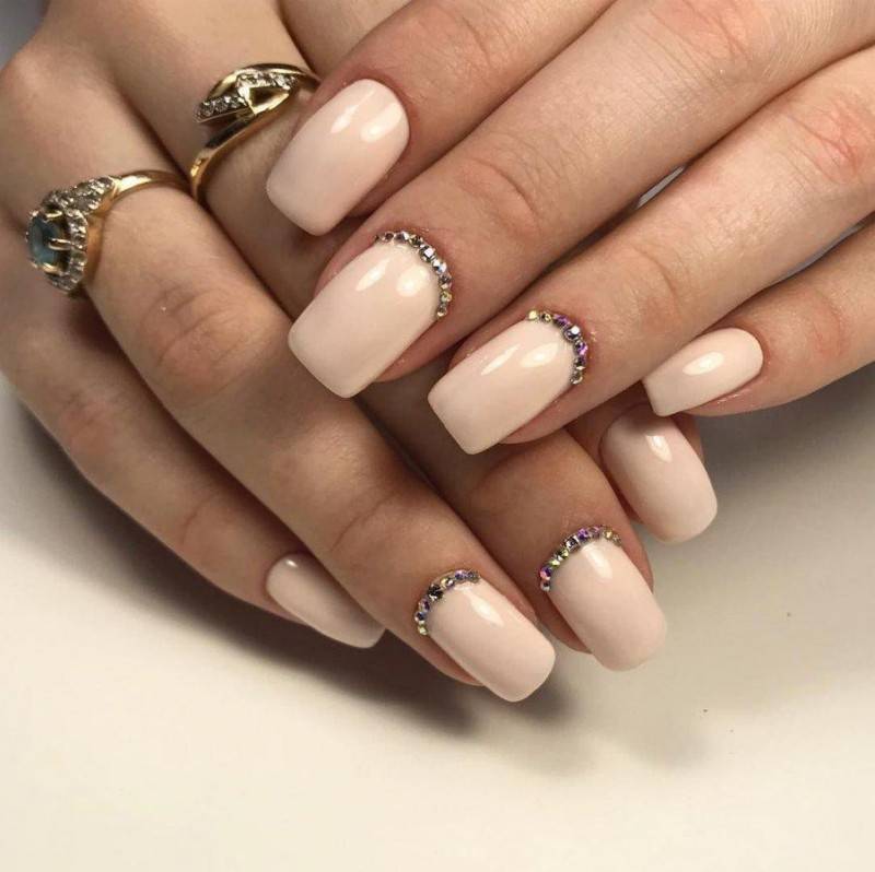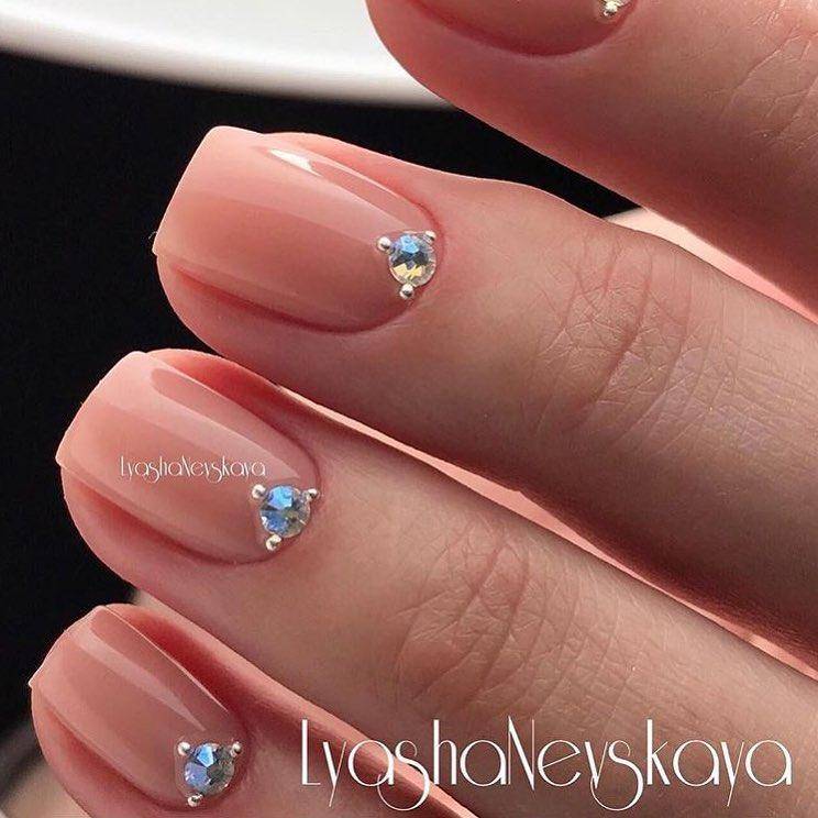 Нюдовые оттенки вот уже не первый год пользуются огромной популярностью в нейл-дизайне, даже если он относится к свадебному. Среди возможных вариантов – античная роза (пудра), светлый беж и даже небесный голубой, каждый из которых прекрасно сочетается с базовым декором в виде выложенных по ногтевому ложу в одну линию страз, самого мелкого шиммера, лепки и прочих вариаций на тему.