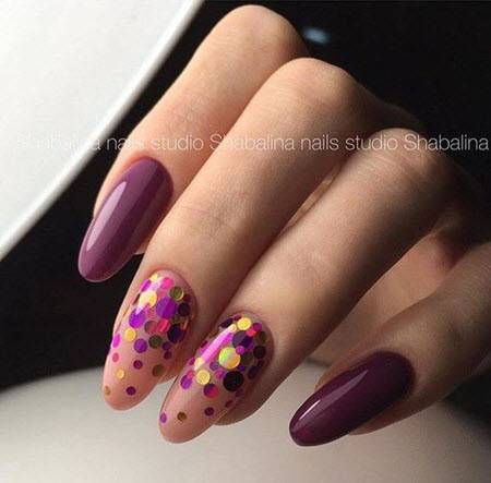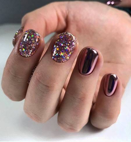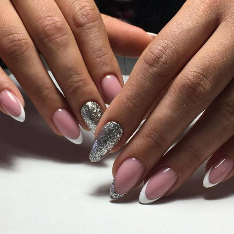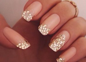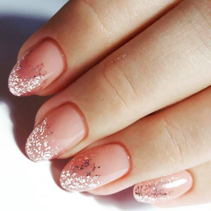 - Начиная от свободного края с рассеиванием к середине нанесите на ноготь серебряный глиттер.