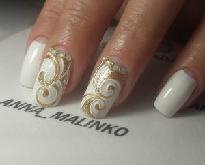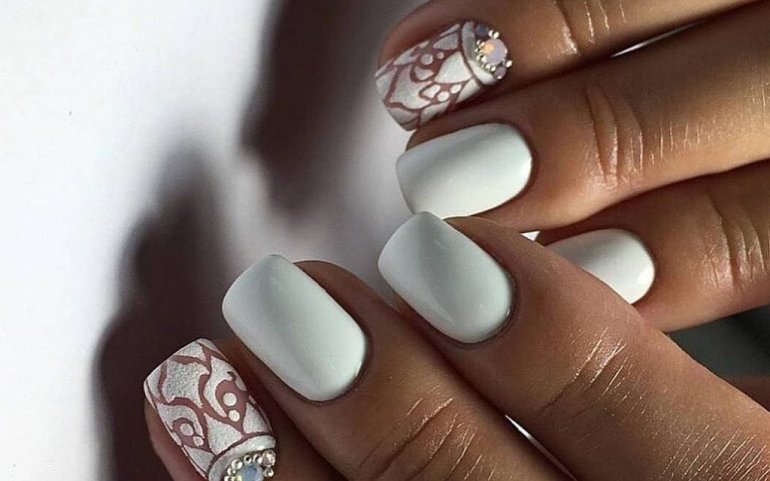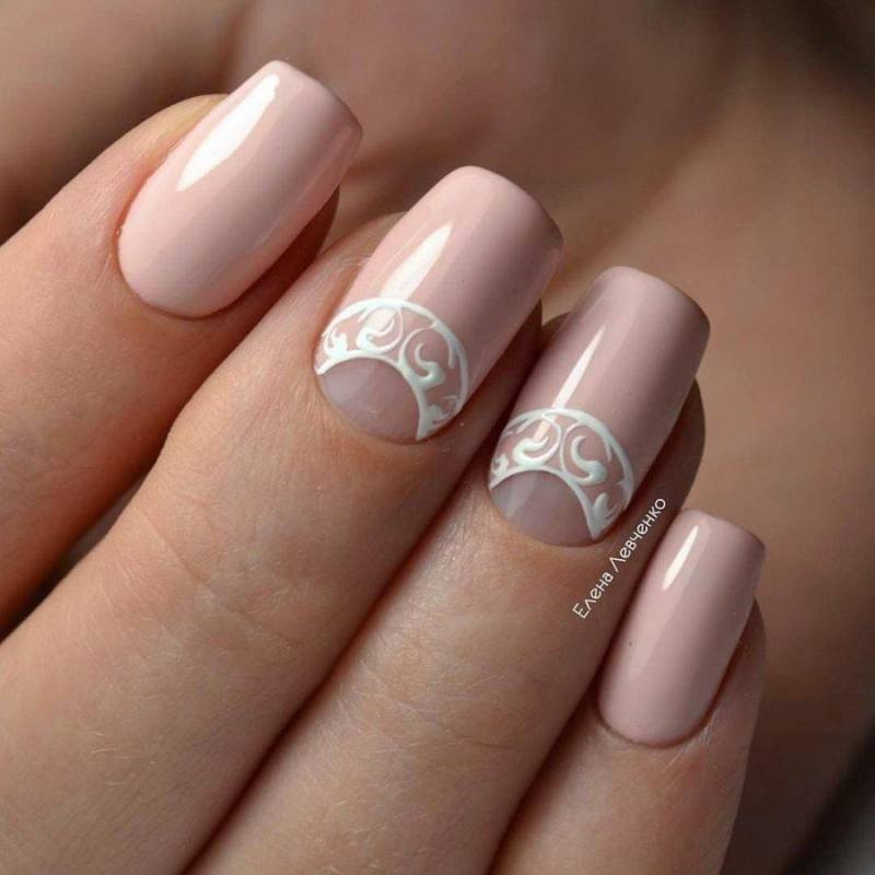 Все оттенки бежевого также являются отличной базой для свадебного маникюра, которая хорошо смотрится как с глянцевым, так и с матовым финишем, а также со всевозможным дизайном. И прежде всего стоит попробовать самую тонкую белоснежную роспись в виде вуали, кружева, орнаментов и цветочных узоров в случае необходимости дополняя их стразами среднего размера.