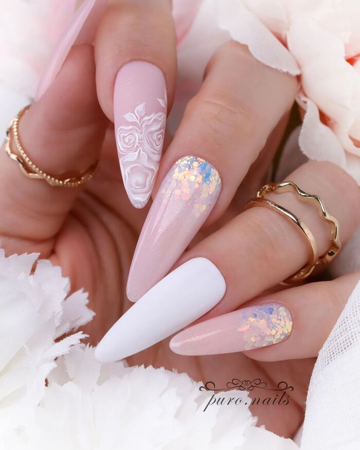 Узоры из точек, сердечки, перья или другие романтические мотивы, чтобы добавить своему образу роскоши и очарования. Нежные варианты нейл-арта идеально подойдут для к широким платьям с открытыми рукавами и пышной фатой.