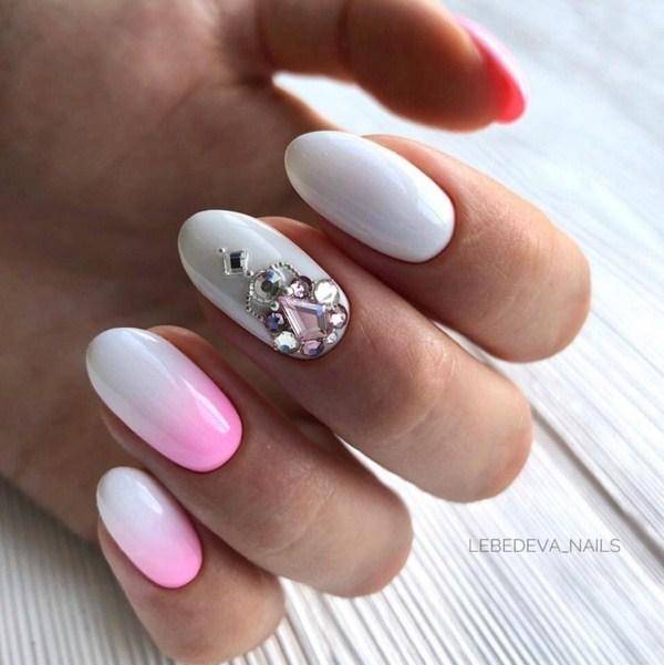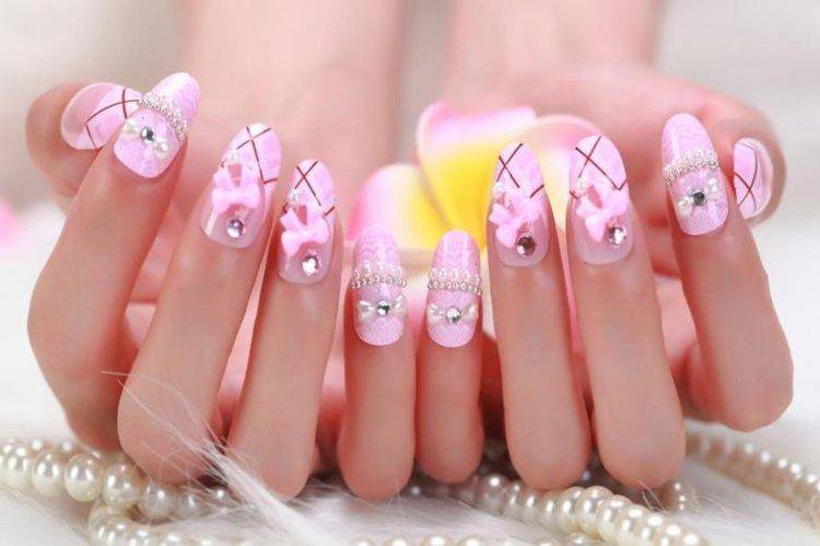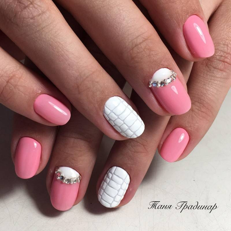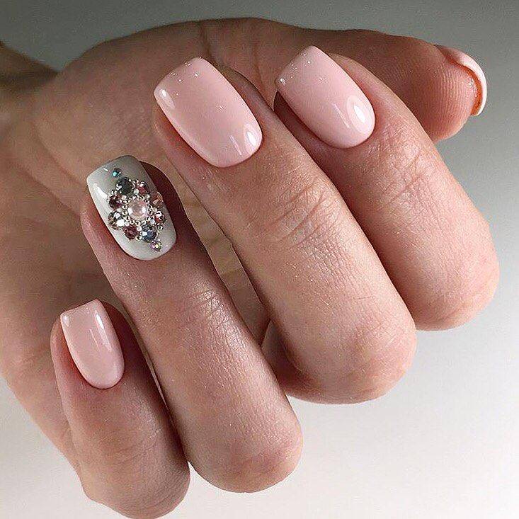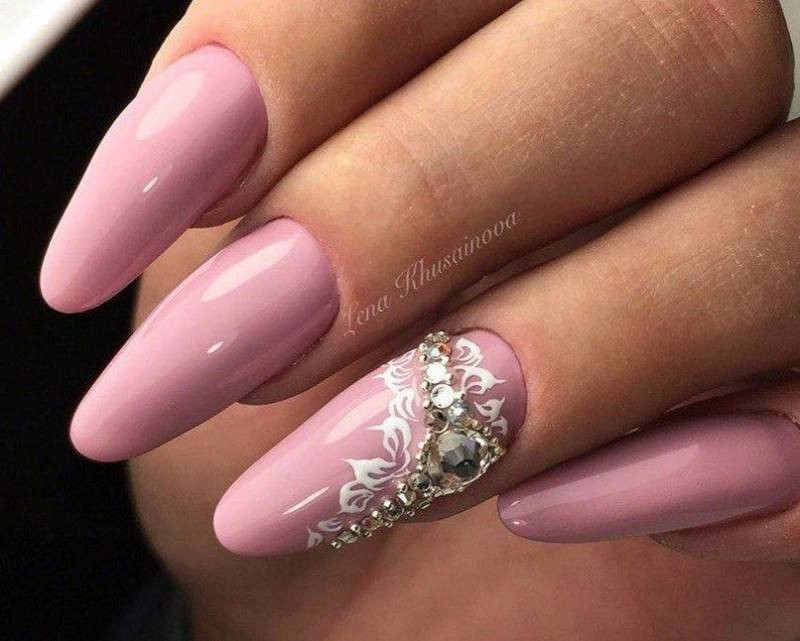 Под нежно-розовое платье или букет – соответствующий цвет. Его можно сочетать с белоснежным френчем, мелкими кристаллами, лепкой и бархатом.