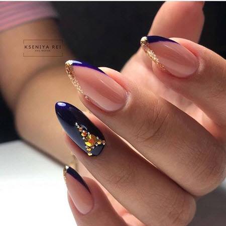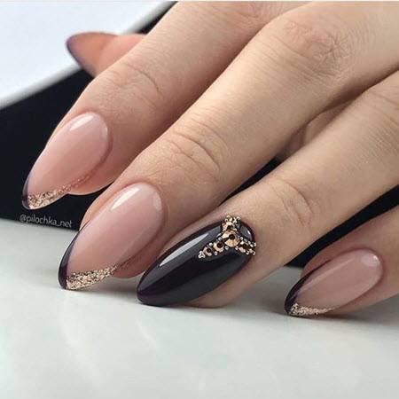 На остальные ногти, по желанию, можно добавить по одной небольшой стразе у корня ногтевой пластины. Так маникюр станет ещё более роскошным и праздничным.