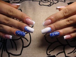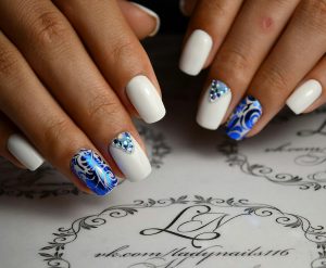 - Тонкой кистью белым цветом начните наносить рисунок. Дотс можно использовать для прорисовки узелков или точечных моментов. Можно покрыть кружевом каждый ноготь, а можно ограничится двумя.