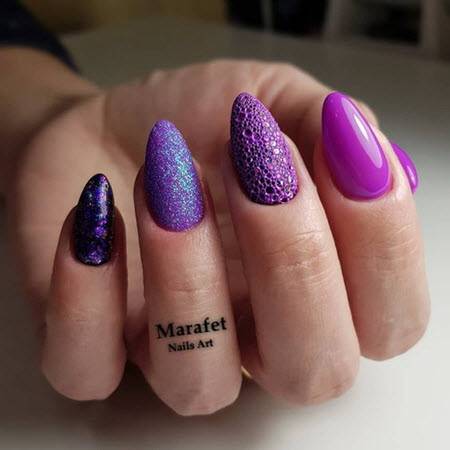 Дизайн в сиреневых тонах — смелый и небанальный маникюр на свадьбу. Оттенки лаванды, сирени и аметиста чудесно смотрятся и на коротких, и на длинных ногтях. Являясь результатом смешения красного и синего цветов, сиреневый — символ баланса, вдохновения.
