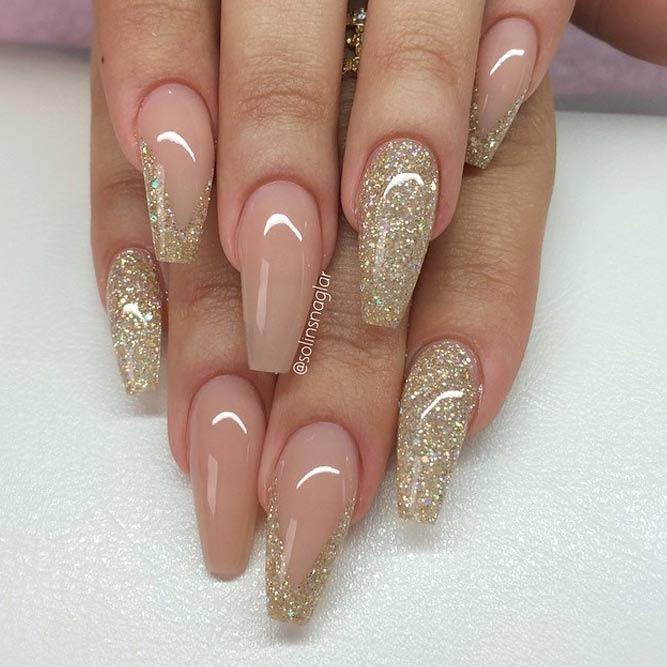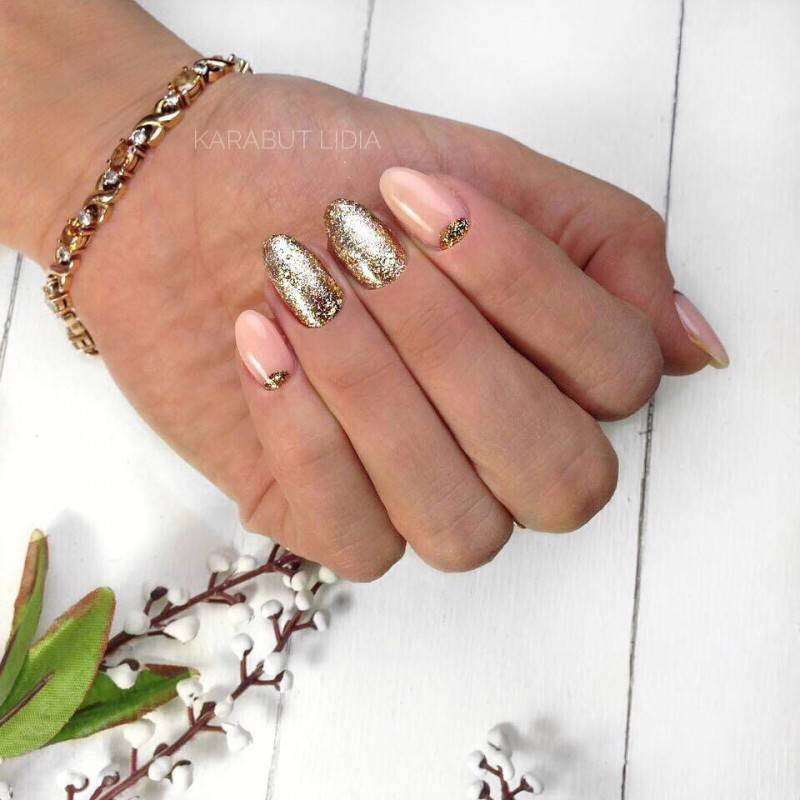 Множество разнообразных вариантов предусматривает и золотой свадебный дизайн. Конечно, полностью перекрывать ногти золотом не стоит, но вот эксперименты с многими такими вариантами приветствуется. Это может быть винтажный декор, крупный шиммер, пайетки, фольга и даже слюда, нанесенные на любой нейтральный фон.