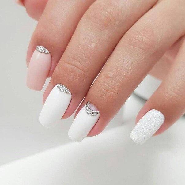 Матовые свадебные ногти можно украсить светящимися элементами в виде фианитов или мелких кристаллов. Вы также можете остановить свой выбор на выкройках. Такой эффект отлично будет смотреться на ногте безымянного пальца, на котором кольцо появится в день свадьбы.