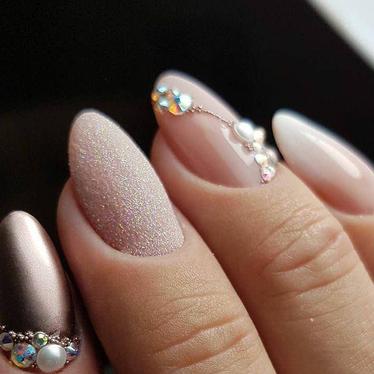 Для невест, которые хотят добавить гламура и дороговизны своему образу, маникюр с украшениями из стразов и глиттера – идеальный выбор. Можно создать изящные узоры из страз или нанести глиттерное покрытие на один или несколько ногтей. Это добавит вашему образу дополнительную роскошь и сияние.