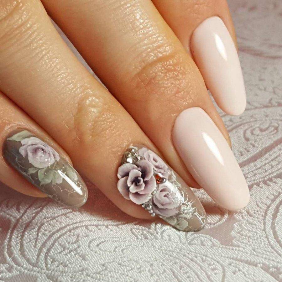 Все оттенки бежевого также являются отличной базой для свадебного маникюра, которая хорошо смотрится как с глянцевым, так и с матовым финишем, а также со всевозможным дизайном. И прежде всего стоит попробовать самую тонкую белоснежную роспись в виде вуали, кружева, орнаментов и цветочных узоров в случае необходимости дополняя их стразами среднего размера.