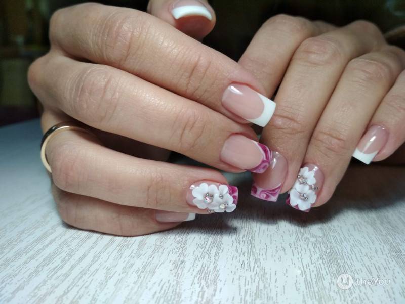 Нежные цветы – еще один прекрасный вариант маникюра для вчерашней школьницы. Изящные бутоны с листиками лучше всего будут смотреться на нежной неброской поверхности. Поэтому тем, кто желает видеть на своих ногтях флористические мотивы, нужно выбирать для основного тона бежевый, светло-розовый, нюдовый или пастельный цвет.