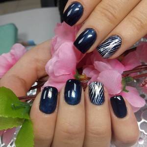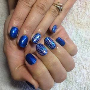 Насыщенный синий маникюр добавляет глубины и аристократичности, но наряд к нему следует подбирать тщательно. Синий фон маникюра подчеркнет платья светло-серого и серебристого цвета, хорошо будет выглядеть сочетание глубокого синего с отливом материала наряда и такого же маникюра. Маникюр темно-синего цвета уместно разбавлять белым и серебристым рисунком. Платья василькового и бирюзового цветов будут стильно подчеркнуты маникюром нежно-голубым с белым. Оттенки синего цвета в маникюре неплохо выглядят с черными нарядами, но они мало подходят для выпускного вечера, так как образ становится тяжелым.