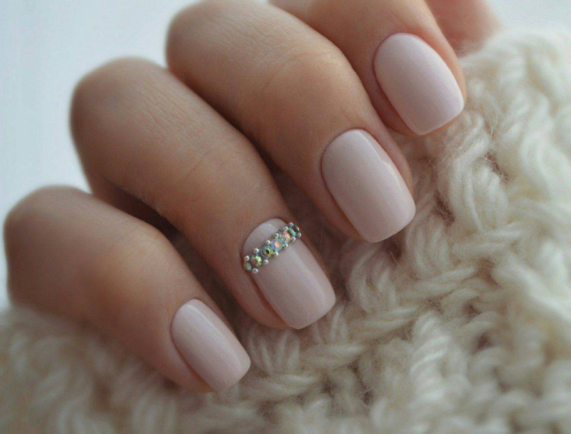 Блестки, стразы, глиттер гармонично сочетаются с однотонным маникюром. В нем можно сделать блестящий акцент на одном-двух ногтях. Несмотря на сдержанность и лаконичность дизайна, маникюр смотрится стильно, подчеркивает хороший вкус.