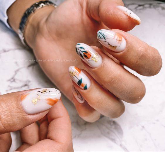 Цветовые варианты дизайна коротких и длинных ногтей довольно разнообразны. Например, возможно монохромная гамма – серая, белая, черная. А также контрастные сочетания приглушенных оттенков осенней природы. Скажем бежевого и шоколадного, желтого и оранжевого, зеленого и кремового. Осенний стиль оформления ногтей узнаваем по золотистому декору и следующим модным оттенкам.