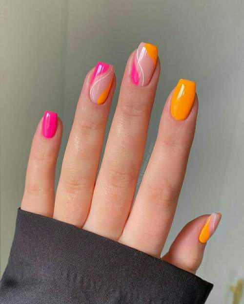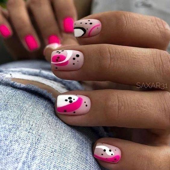 Розовый усилит выразительность маникюра. Например, красно-розовый дизайн или приближенный к классике вполне гармонично смотрится на коротких и длинных ногтях.