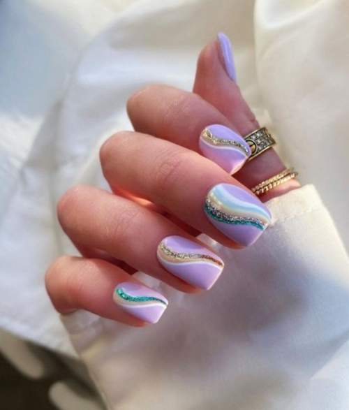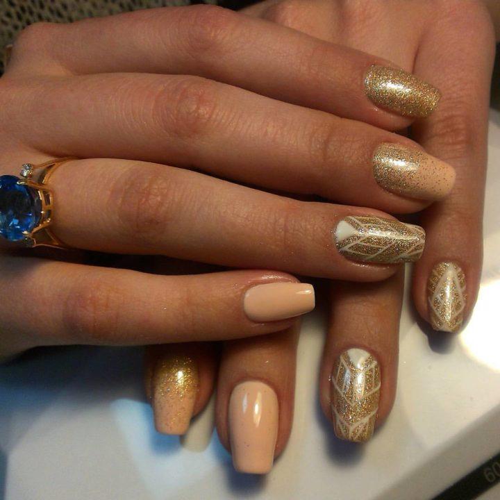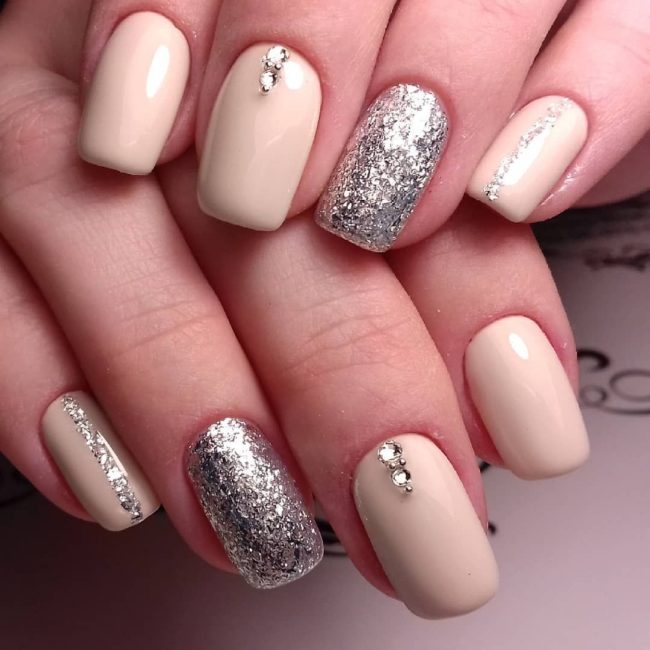Этими элементами можно выполнить очень много дизайнов, которые не только не нарушат спокойствие повседневности, но и смогут привнести нотки задорности или, наоборот, роскоши. Золото и серебро может поучаствовать в написании букв или в геометрии. Глиттером можно сделать френч или лунки. Фантазия здесь безгранична.