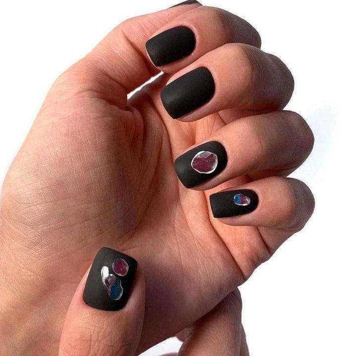 Чаще всего кляксы рисуют базой, а сверху приклеивают кусочек блестящей фольги. Сама фольга может быть абсолютно любого цвета, что позволит вам выбрать будущий вид маникюра из большого количества предложений. Вместо фольги можно использовать блестки и лаки для ногтей.