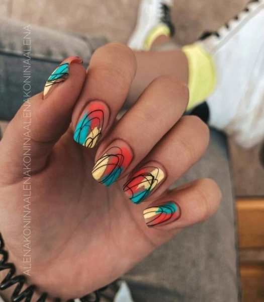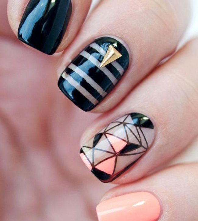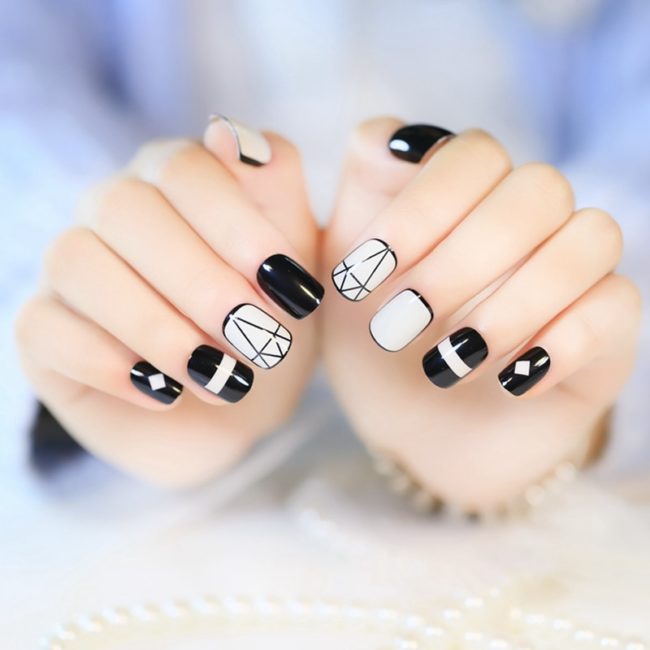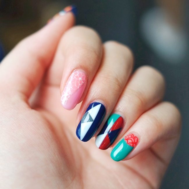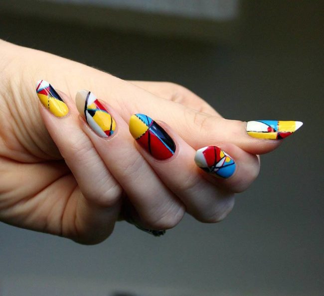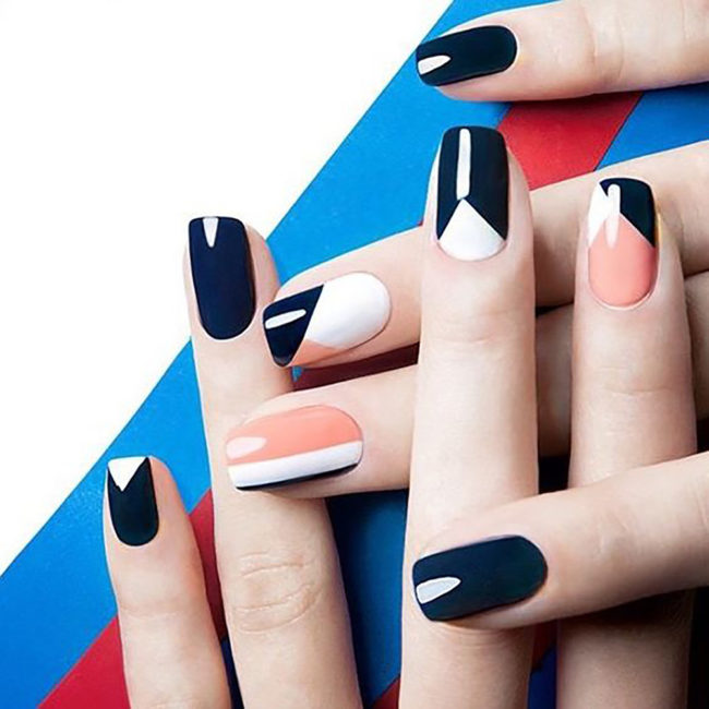 Геометрический рисунок прекрасно смотрится на любых ногтях. Прямоугольники и полосы визуально вытянут короткие ногти, овалы смягчат стилет или миндаль. Но только при условии вертикального расположения. Если же изображение находится в горизонтальной плоскости, то получится иллюзия укорачивания ногтевой пластины. Цветная мозаика придаст игривости и задорности. Строгость форм подойдет на каждый день и может прочно занять место повседневного маникюра.