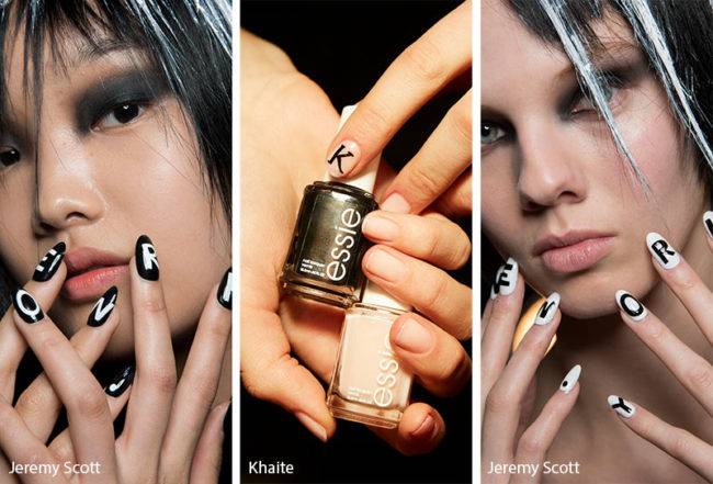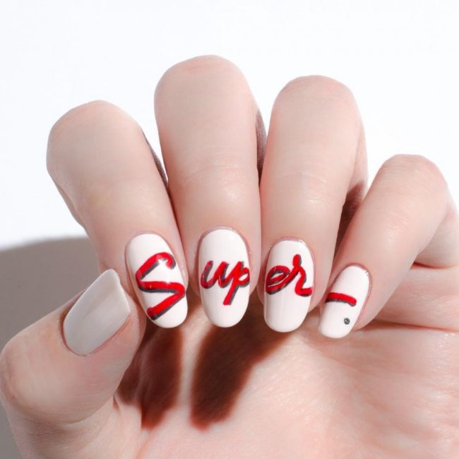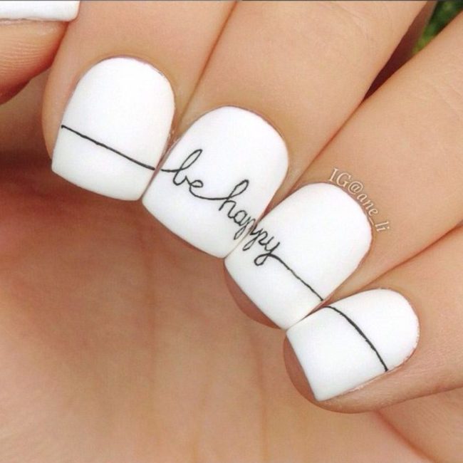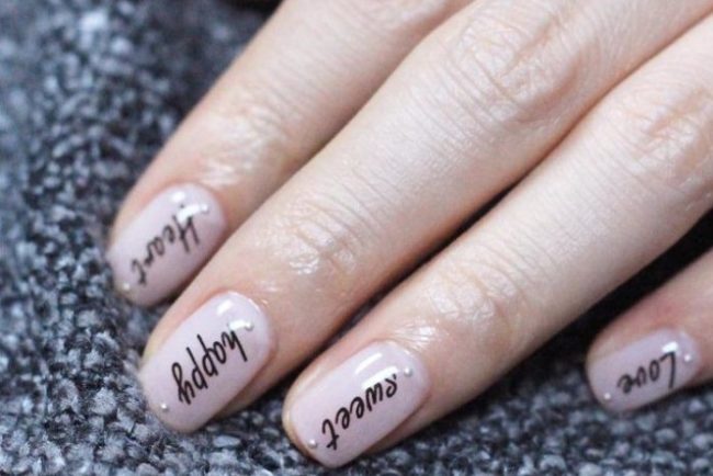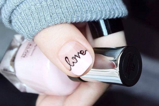 Времена вензелей постепенно уходят в историю, и все чаще можно увидеть новинки нейл-арта с использованием букв и надписей. Эти дизайны просты и нетребовательны к общему образу модницы. Цветовая гамма основного покрытия может быть любой. Единственное требование: однотонность и отсутствие перламутра. А вот буква должна контрастировать с цветом, чтобы быть хорошо заметной. Тоже касается и надписи. Но для использования такого дизайна, следует учитывать длину ногтя. Буква может располагаться на короткой ногтевой пластине, а вот надпись лучше разместить на длинной. Украсить лучше один – два ногтя. Если расписать все пальцы, то ляпистость гарантирована. Гораздо интереснее смотрятся френч или лунки, а также втирка на мизинце.