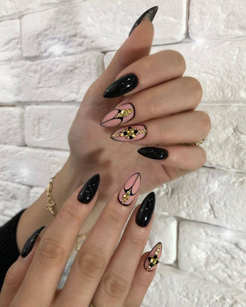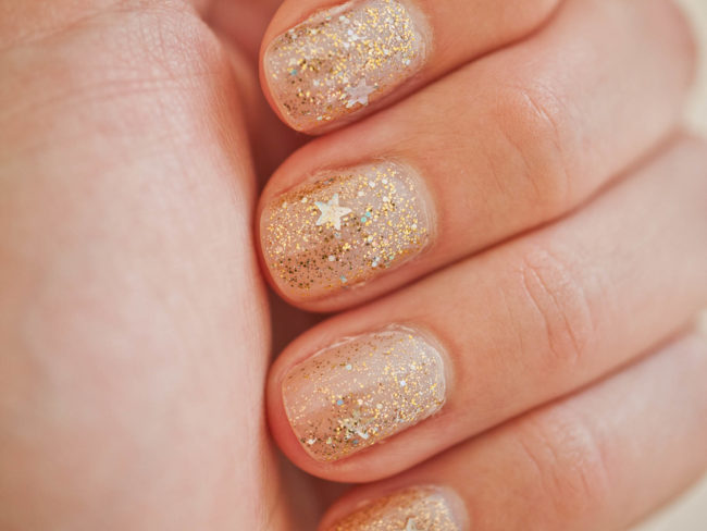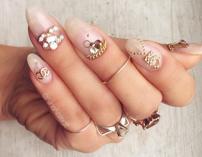Популярным видом декора выступают золотые стразы и блестки. С помощью них можно создать по-настоящему роскошный маникюр.