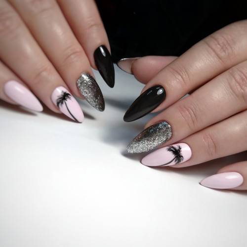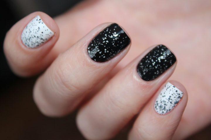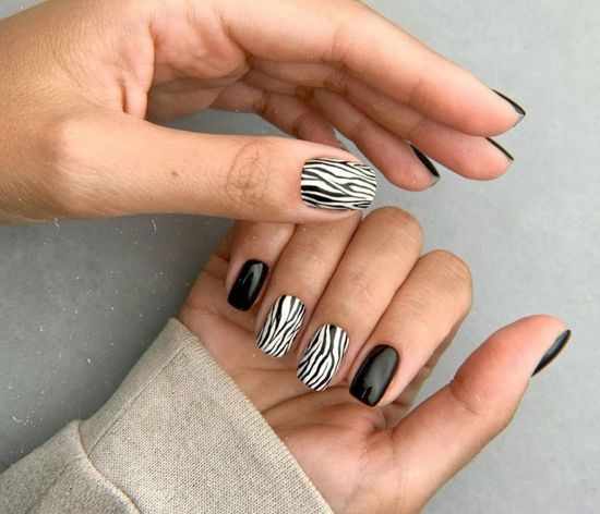 Ахроматическое сочетание включает в себя белый, черный цвет, а также различные оттенки серого между ними. Они великолепно смотрятся в одном маникюре в любой комбинации. Примечательно, что в отличии от предыдущего варианта, с данными оттенками прекрасно сочетаются хроматические тона. В результате получается выразительный, яркий маникюр. Поэтому если вам нравится контрастное сочетание, то смело используйте его для оформления ногтей.