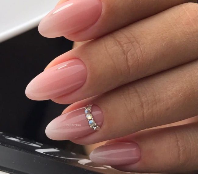 Если обычный нюд выглядит слишком однотонно и мягко, попробуйте маникюр с переходами цвета. Для офиса можно создать оттенок из камуфляжного геля в белом цвете, а для повседневной жизни — любую близкую или контрастную цветовую гамму.