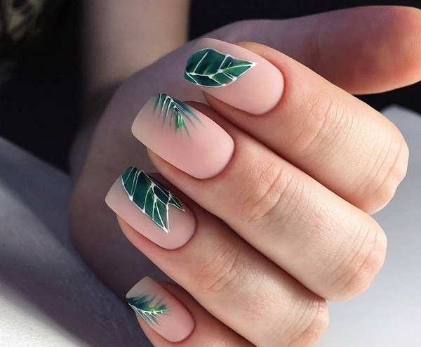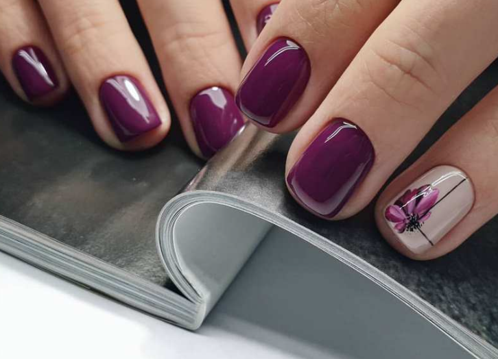 Еще одна красивая идея – покрыть все ногти одним цветом, а безымянный оставить прозрачным и нанести на него рисунок цветка или веточки. Наиболее актуальными оттенками являются синий, кофейный, оливковый и красный.