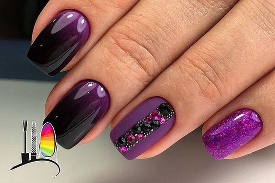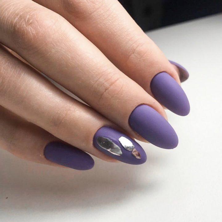 Внесение фиолетовых акцентов в осенний дизайн ногтей может быть умеренное и ограничиваться двумя сочетающимися тонами. К каждому дизайну можно подобрать осенний рисунок или узор.