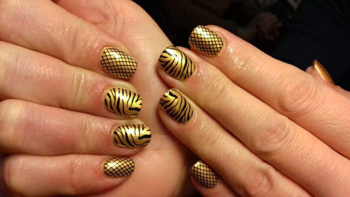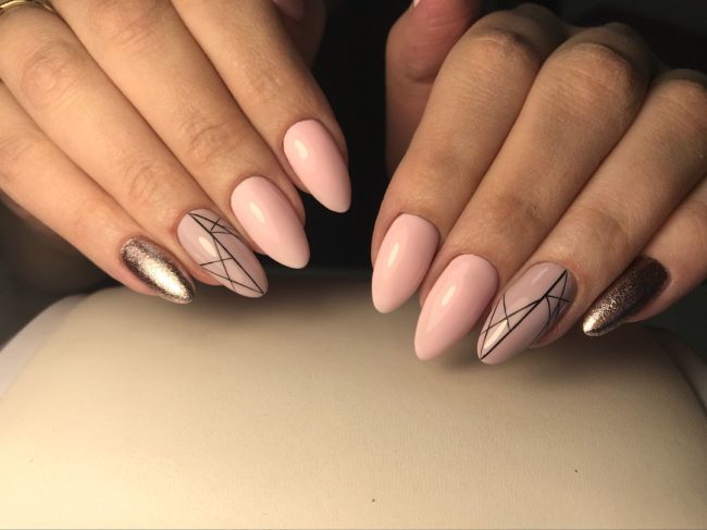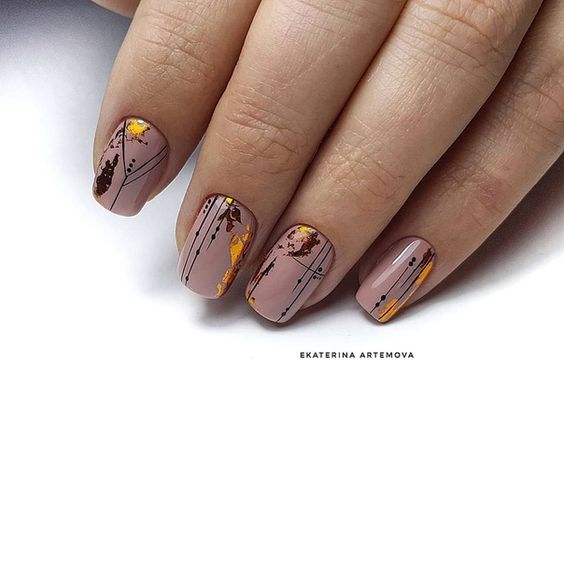 Это очень смелый дизайн. Главное правило: основа должна быть нюдовая. Так ногти не будут выглядеть вульгарно. Светло-розовая основа с добавлением золота и леопардового принта – хит осеннего сезона.