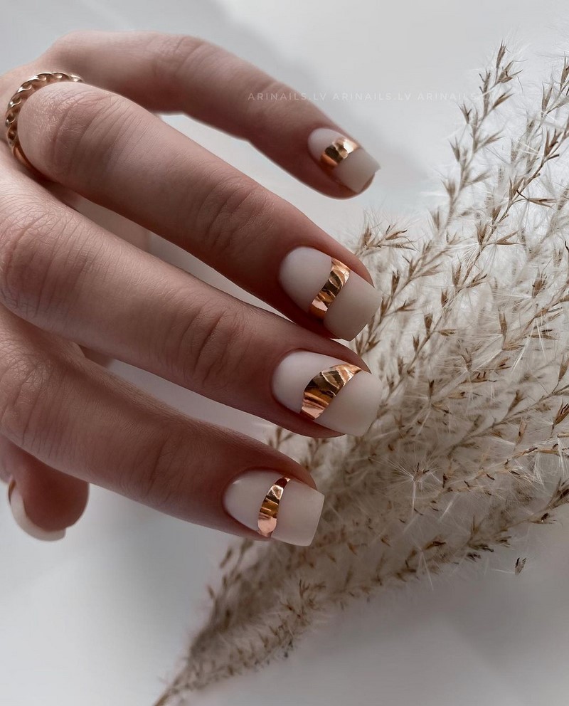 Осенний период 2023 года предлагает обильно украшать свои ноготки золотом. Это может быть золотой лак, золотые рисунки и декоры.