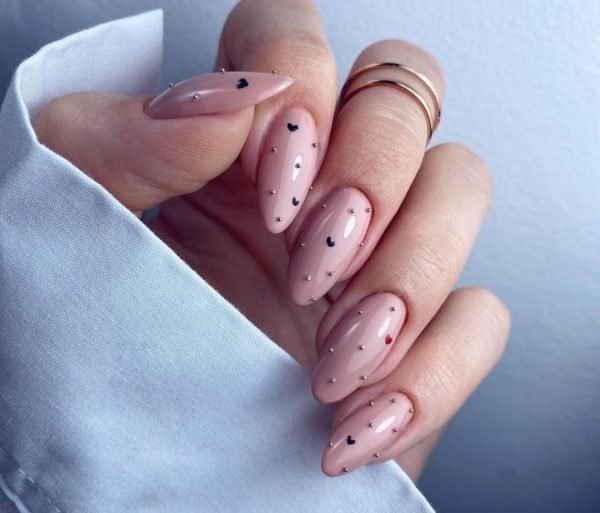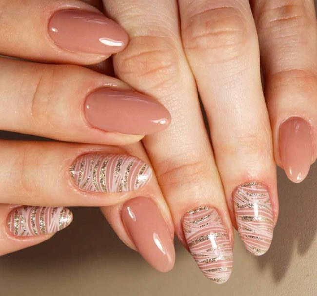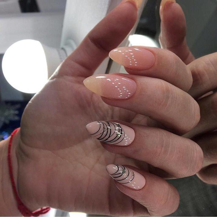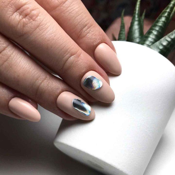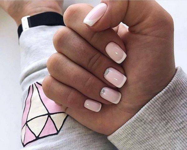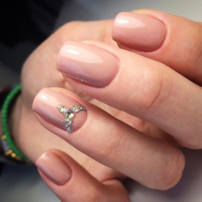 Нюдовые оттенки и короткая длина делают ноготки максимально естественными. Стильное и элегантное решение уместно в любом образе. При желании его можно разнообразить цветным узором в виде сердечек, металлическим блеском за счет потали. гнущихся лент, втирки. Уместно выглядят комбинации с мраморной темой или звериным узором.