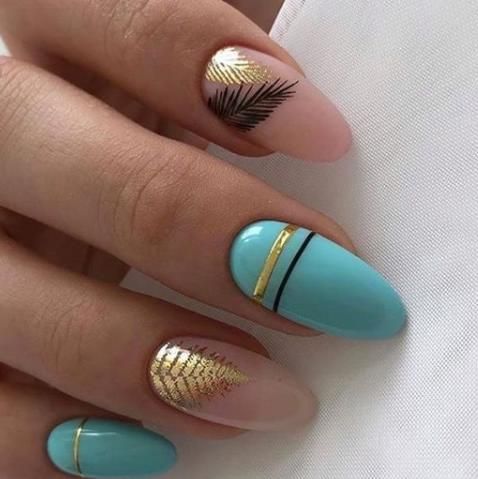 Также мастера выделяют синие оттенки лаков. Оформление ногтей предпочтительнее делать цветными контрастными блоками, которые способны на выразительность. Вроде темно-синий и голубой, ярко-синий и оранжевый/розовый. Также синие линии на светлой подложке придадут актуальность дизайну.