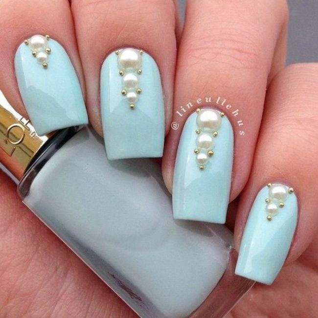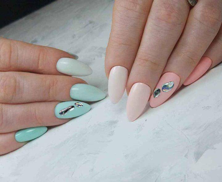 Мятные оттенки, сочетание матового и глянцевого покрытий, уместная инкрустация – залог трендового маникюра. Идея, которой обязательно стоит воспользоваться.