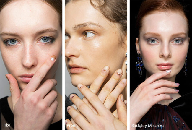 В моде всё так же присутствуют нюдовые оттенки, следуя за всё более популярной в последнее время тенденцией на естественность. Используйте в маникюре такие цвета как: коричневый, бежевый, пудровый, бледно-розовый и другие, чтобы ваши ногти выглядели элегантно и женственно. В моде так же пастельные оттенки. Не станет менее актуальным и лимонный цвет, который был в моде летом. Одной из самых интересных тенденций является вновь ставший трендом френч и лунный маникюр, однако френч можно разбавить и сделать не классическим белым цветом, а жёлтым или оранжевым, а для особенно смелых девушек на модных показах был представлен разноцветный френч, где каждому ногтю был присвоен свой цвет.