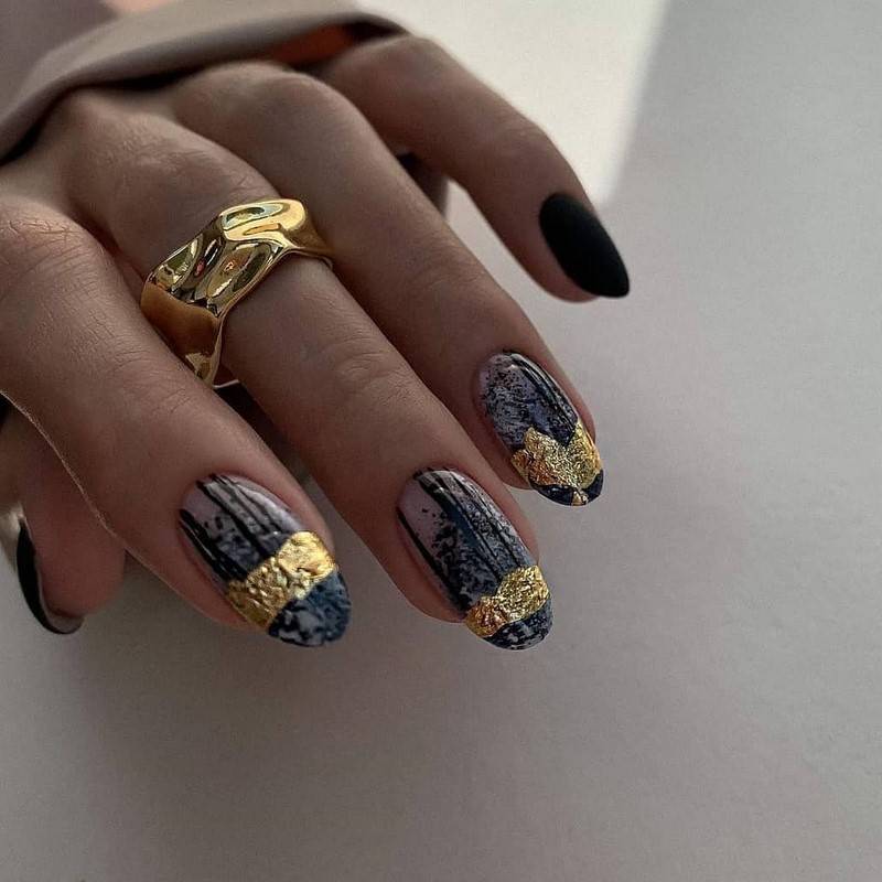 Правильные геометрические формы потихоньку уступают свое место абстрактному дизайну. Вот и осенью 2023 года абстракция применяется в любой технике нейл-арт вне зависимости от стиля маникюра. На короткие ногти эффектно выглядят акварельные разноцветные мазки в тандеме с кусочками сусального золота.