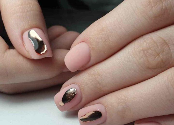 В декорировании ногтей на осень 2023 года безоговорочным лидером остается поталь. Особенно уместно ее применение в коротких ногтях. Выигрышно он смотрится покрытый несколькими слоями геля либо на поверхности, закрепленный только топом.