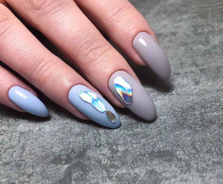 В данном случае в одном дизайне сочетают несколько оттенков одного цвета. К примеру, пастельный синий, классический и яркий цвет. Очень часто девушки наносят на каждый ноготок разный оттенок, благодаря чему маникюр смотрится совершенно по-другому. Но все же, в 2020 году более актуальным будет двухцветное покрытие в виде градиента. Реализовать его можно с помощью обычных лаков даже в домашних условиях. Впрочем придется дополнительно приобрести простую губку для создания мягкого перехода. В качестве декора уместными будут стразы и блестки, которые сделают маникюр чуть более ярким.
