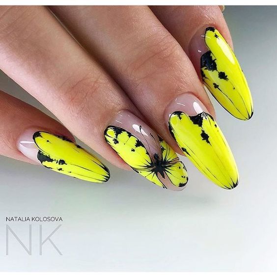 Дизайн ногтей с осенними листьями может выглядеть весьма необычно и креативно. С помощью осенних листочков на ногтях можно изобразить некое очертание бабочек, получив в результате нечто особенное и максимально женственное. Осень и бабочки в данном контексте идеально сочетаются между собой. Благодаря правильно выбранным приглушенным оттенкам бабочки выглядят максимально по-осеннему. Не забывайте прорисовывать тонкие детали и контур контрастным цветом лака, лучше черным. В данном дизайне важна каждая малейшая деталь