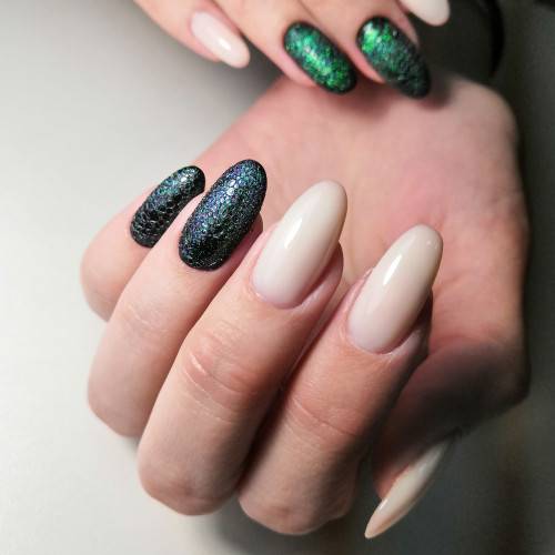 Этот эффект делается с помощью специального магнита. «Кошачий глаз» не всегда украшает каждый палец. Такой вариант можно выбрать в качестве украшения в стиле фэн-шуй, подчеркнув один или два ногтя. Также он хорошо смотрится в ансамбле с другими украшениями. Одним из популярных решений является изумрудная втирка. Но в этом случае покрытие необходимо наносить на разные ногти.