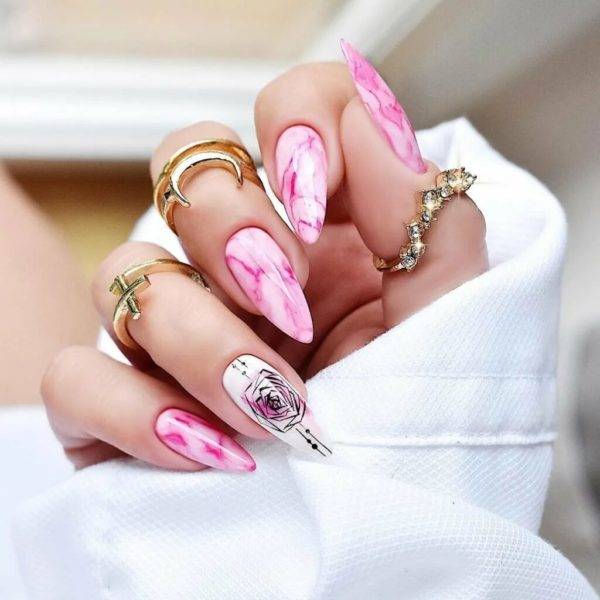 Длинные ногти в этом году оформляются с помощью однотонного покрытия с нанесением на них узоров и рисунков, стразы или бусины крепятся только на 1-2 ногтя на руке. На длинных ногтях отлично смотрятся продольные полосы, мраморный маникюр.