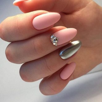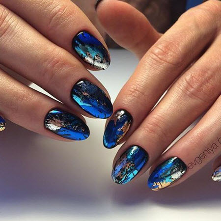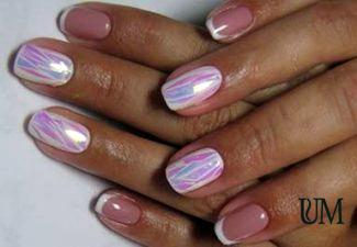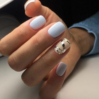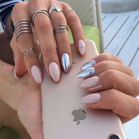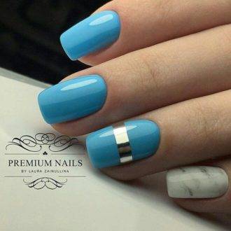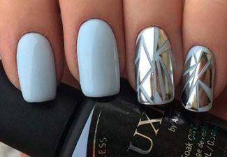 Фольга и «металлизированные» лаки будут самим подходящим элементом декора нейл-арта в теплое время года, произведенного в пастельных тонах. Нужно только наклеить горизонтальную или вертикальную ровную полоску по центру ногтевой пластины окрашенной в голубой, сливочный, персиковый или розовый цвет, и шедевр готов! Такой маникюр прекрасно выглядит на овальных ноготках.